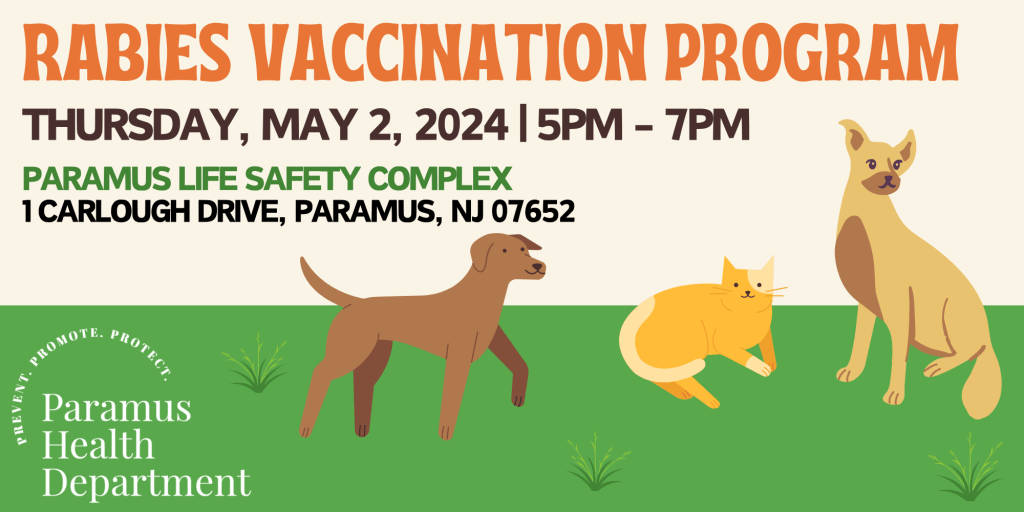 Pet licenses will expire on June 30, 2025, for cats and dogs. The Paramus Health Department will be holding their annual free Rabies Vaccination Clinic on Thursday, May 1st, 2025, from 5pm to 7pm at the Paramus Life Safety Complex at 1 Carlough Drive, Paramus, NJ 07652.
